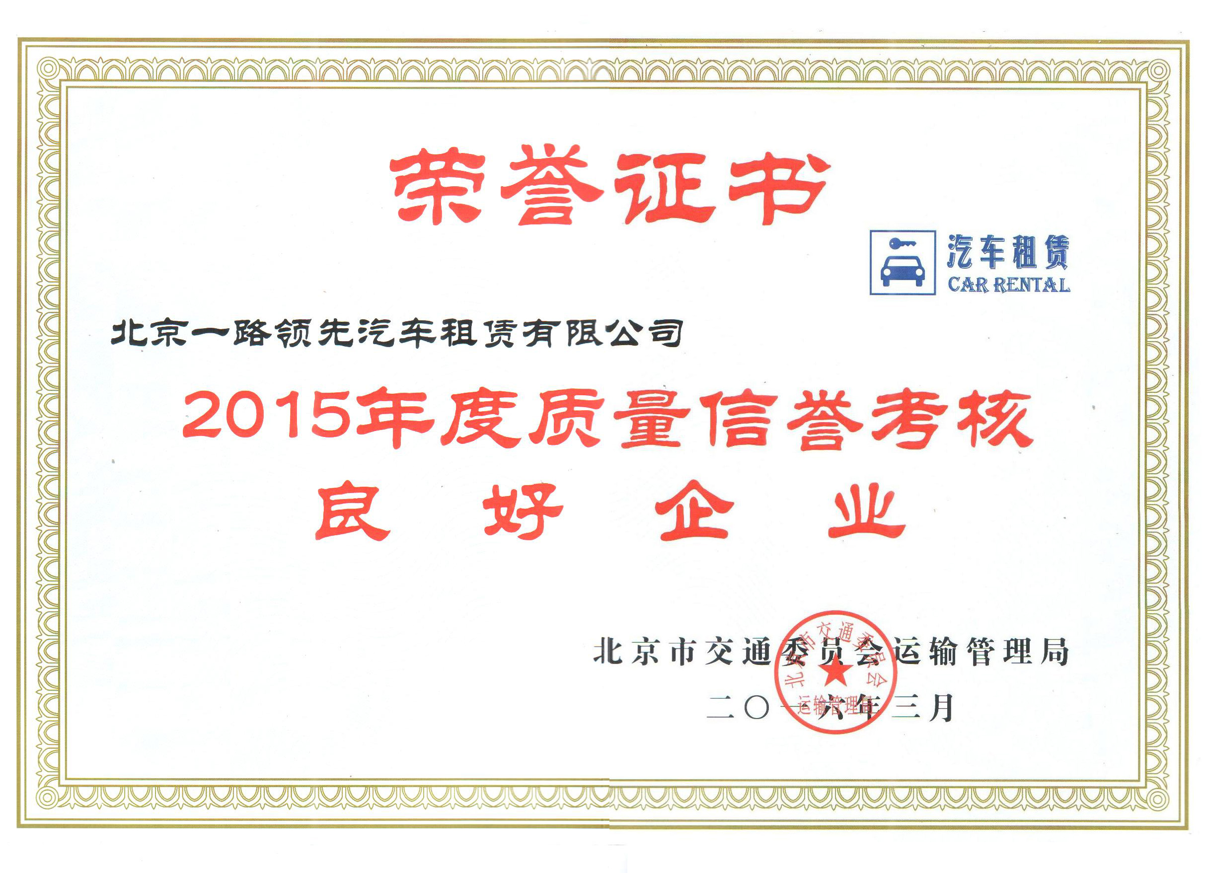 2016年04月08日熱烈慶祝北京一路領(lǐng)先汽車租賃有限公司榮獲優(yōu)秀良好企業(yè)榮譽(yù)